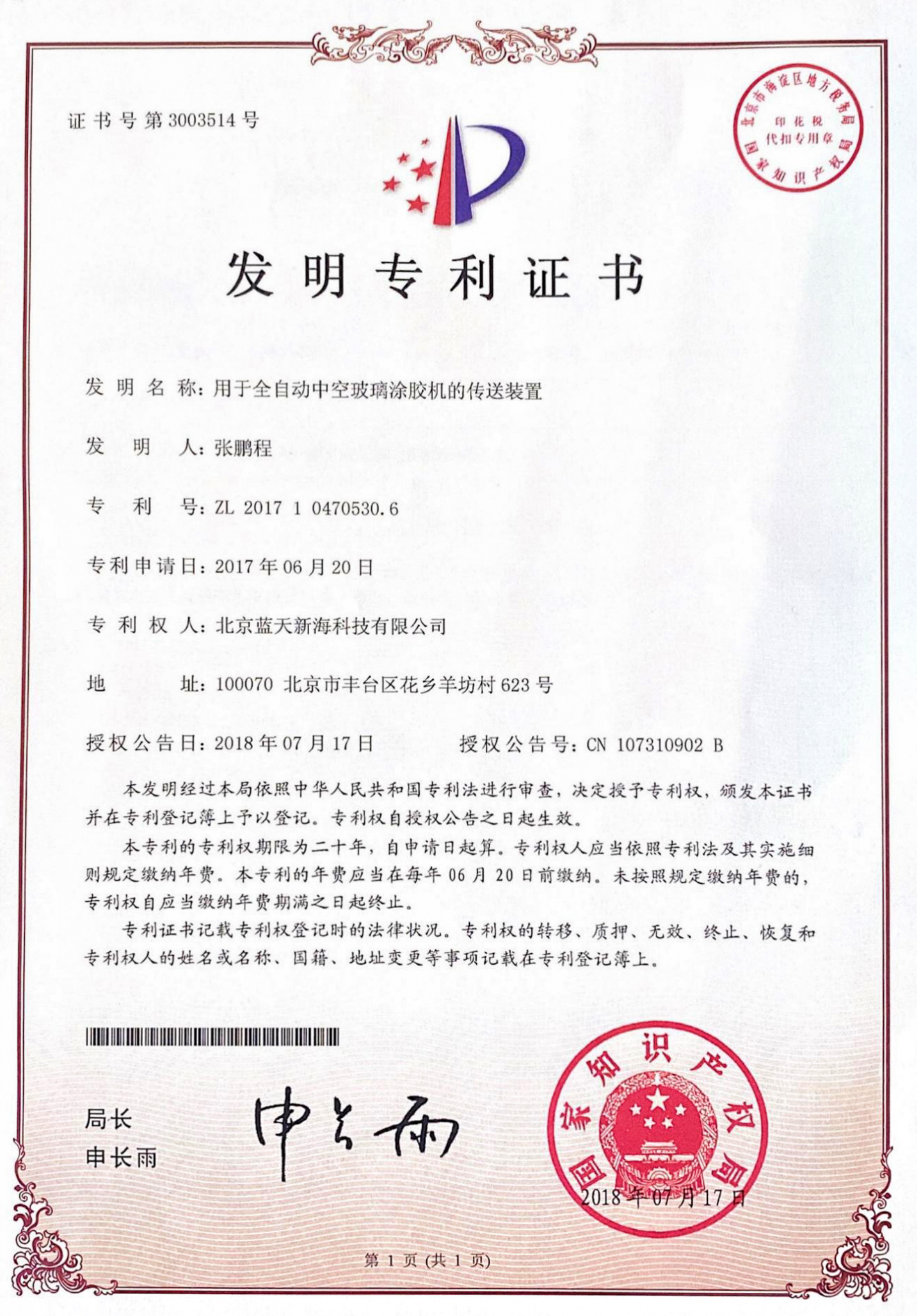 名称:一种全自动立式中空玻璃涂胶机的涂胶装置       名称:用于全自动中空玻璃涂胶机的传送装置